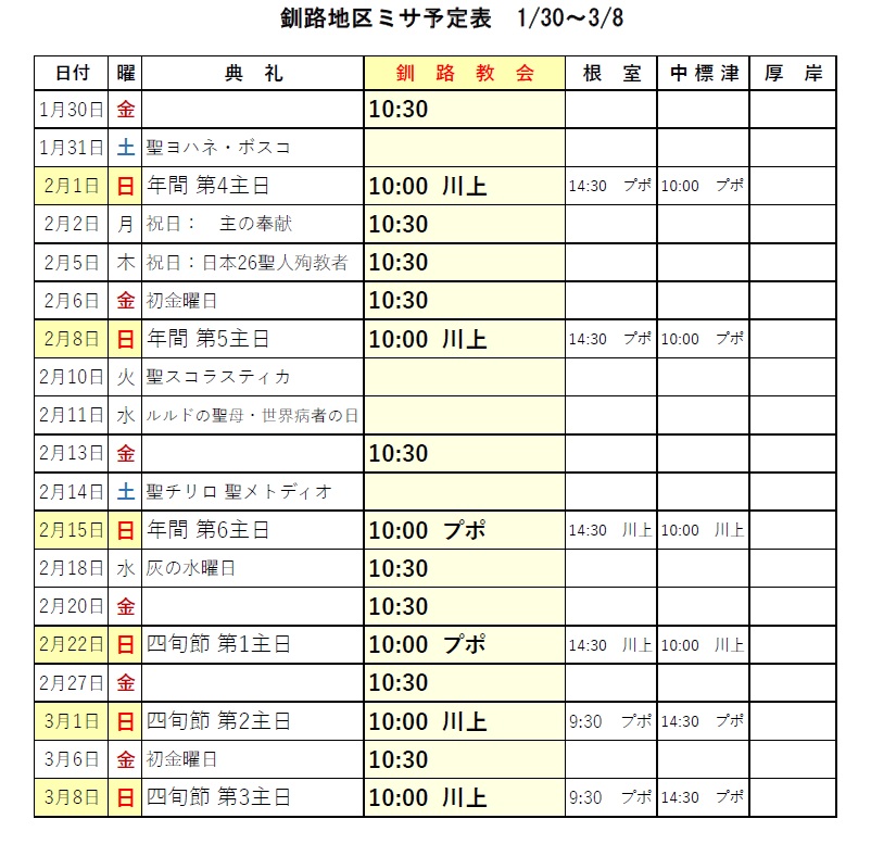 | 主日のミサ | 日曜日 | 午前10時 | カトリック釧路教会 |