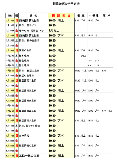 釧路地区ミサ予定(2025年3月-5月31日)